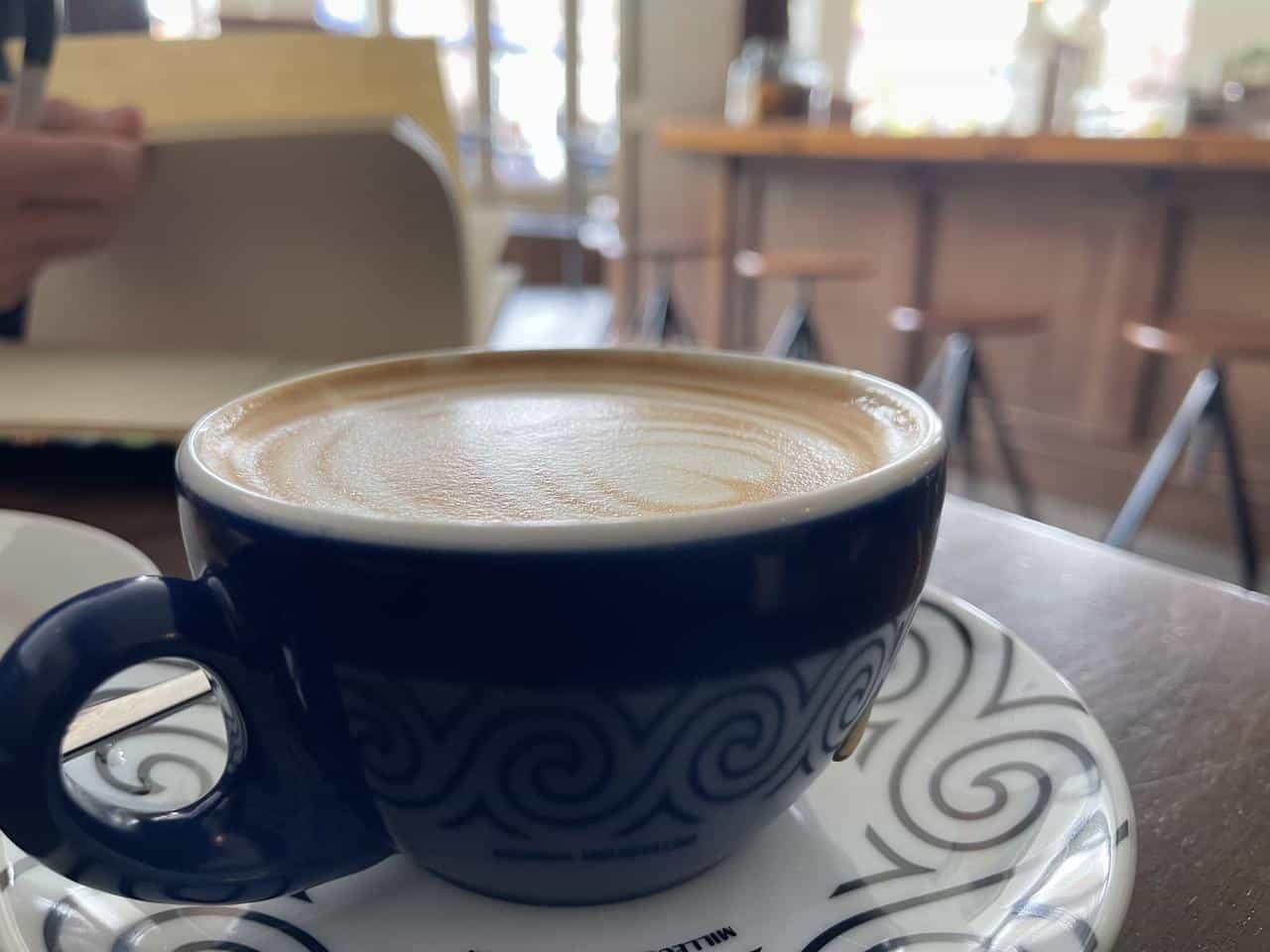 A flat white sits invitingly on a table at Amherst Coffee in Western Massachusetts.