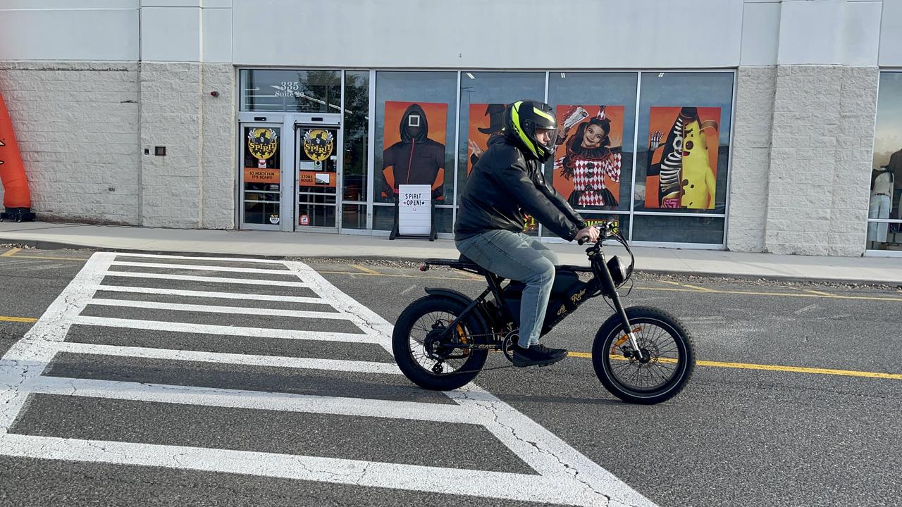 Shall we get a broom? A rider on an electric bike zooms past the Spirit Halloween shop at Mountain Farms Mall in Hadley.