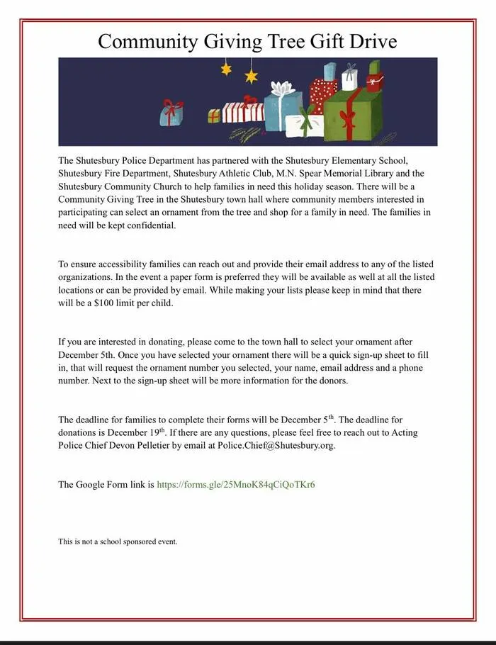 The annual Shutesbury Christmas Tree Lighting and Santa Visit will take place on Sunday, December 7, 2025, at 4:30 p.m. on the Shutesbury Common. The