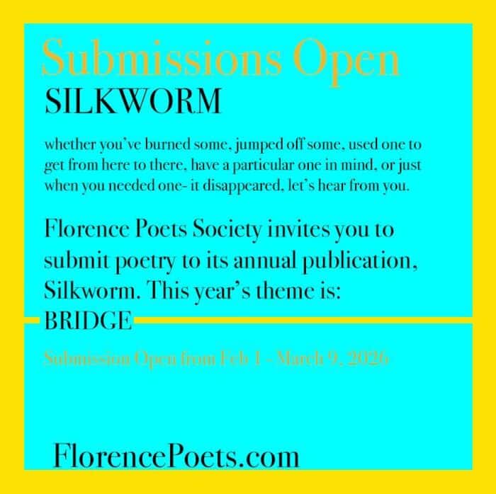 The Florence Poets Society is accepting poetry submissions for its annual publication, Silkworm, through March 9, 2026. The theme for the 2026 edition is “Bridge.” Poets are invited to submit work exploring this theme.