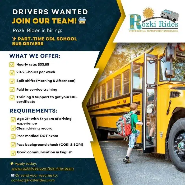 Rozki Rides, LLC is hiring part-time CDL school bus drivers. The position offers an hourly rate of $33.85 for 20-25 hours per week with split morning and afternoon shifts. The company provides paid in-service training and support for obtaining a CDL certificate.