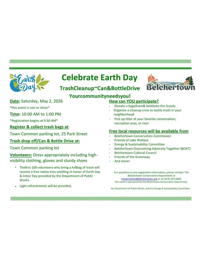 Belchertown will celebrate Earth Day on Saturday, May 2, 2026 (rain or shine) from 10:00 AM to 1:00 PM. Registration begins at 9:30 AM at the Town Common parking lot, 25 Park Street. Volunteers can collect trash bags at registration and drop off trash and redeemable cans/bottles at the same location. The first 100 volunteers returning a full bag of trash will receive a free tree seedling. Light refreshments will be provided. Local organizations including the Conservation Commission, Friends of Lake Wallace, and BOAT will be present.