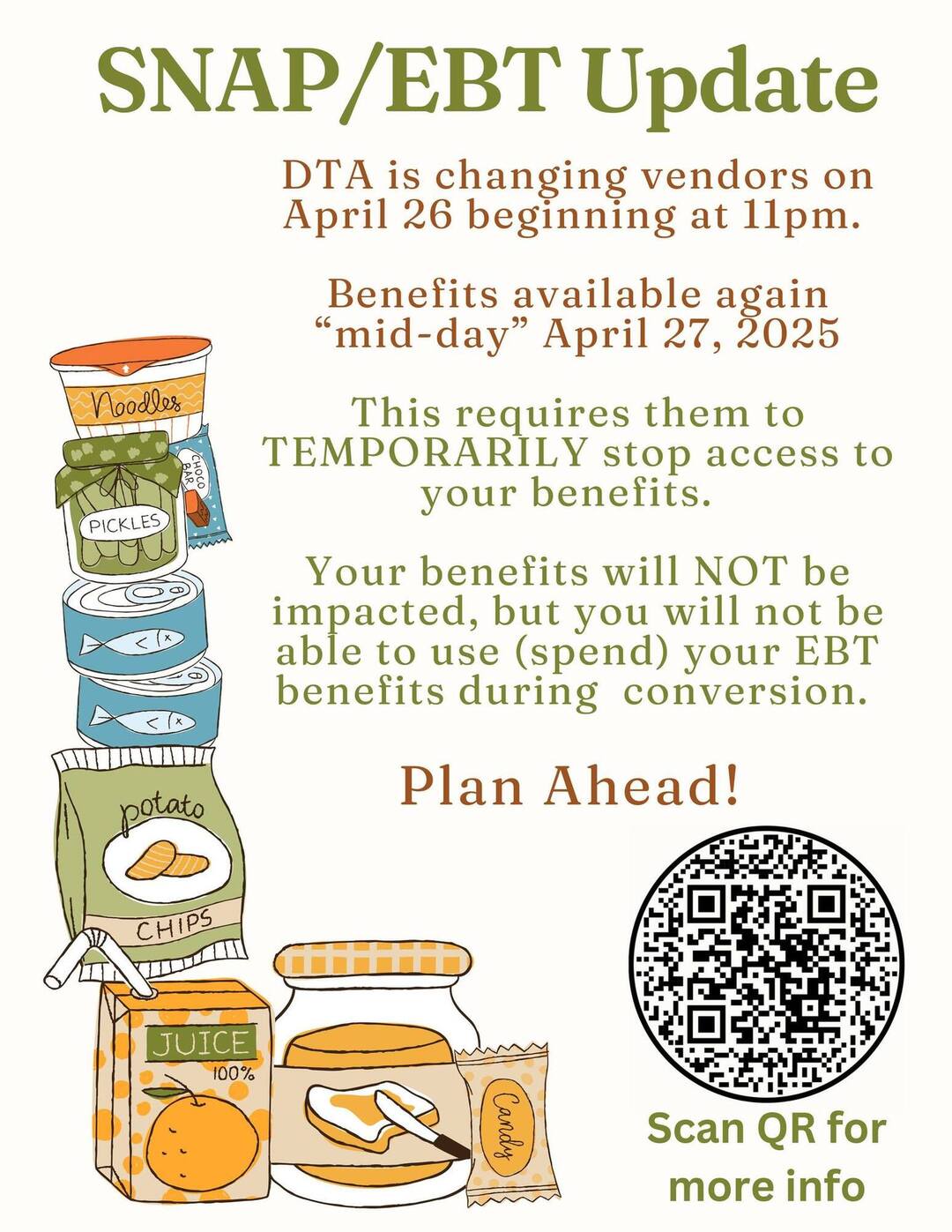 - Temporary service interruption: EBT cards cannot be used during the transition