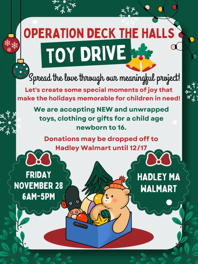 Operation Deck the Halls is running a Christmas toy drive for Hadley families in 2025. New, unwrapped toys, clothing, or gifts for children from newborn to age 16 can be donated at Walmart in Hadley, Massachusetts on Friday, November 28, 2025, from 6 AM to 5 PM, with additional donations accepted at Hadley Walmart and Most Holy Redeemer through December 17, 2025. Family sign-ups for up to 50 children are open until December 6, 2025, or until all slots are filled, with priority for Hadley families and Hadley school system families.