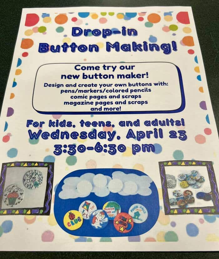 Create custom buttons at this all-ages crafting session at Pelham Library (2 South Valley Rd) on Wednesday, April 23, 2025, 3:30-6:30 PM.