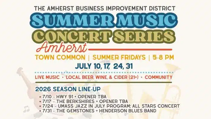 The Amherst Business Improvement District will host a Summer Music Concert Series on four Fridays in July: July 10, 17, 24, and 31, from 5:00 PM to 8:00 PM on the Amherst Town Common. The free concerts feature local and regional artists:
