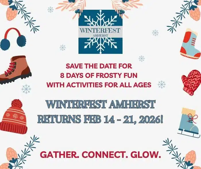 WinterFest Amherst, the town’s annual community winter celebration, will be held from Saturday, February 14, through Saturday, February 21, 2026. The week-long event will feature a variety of free and affordable cultural, educational, and recreational activities for all ages throughout Amherst.